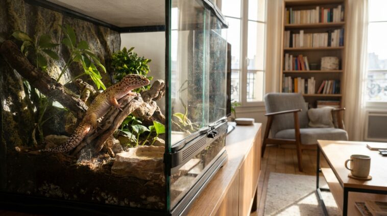 Ces cinq reptiles couramment adoptables nécessitent chacun un terrarium rigoureusement adapté. Fini le simple bocal improvisé ! La longueur, la largeur et la hauteur de l’habitat doivent correspondre au mode de vie de l’animal. Le serpent des blés nécessite une longueur lui permettant de s’étirer complètement. Le gecko à crête, quant à lui, a un besoin vital de verticalité pour grimper et sauter d’une branche à l’autre. Le terrarium devient un véritable meuble technologique, un écosystème fermé qui représente souvent l’investissement financier le plus lourd de cette adoption.
