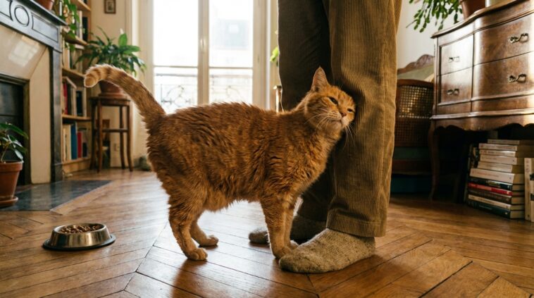 Le chat a besoin de vérifier que son groupe social — c’est-à-dire vous — est toujours présent et disponible. Plus important encore, il cherche à effectuer un marquage facial. Lorsqu’il se frotte contre vos jambes ou votre visage au saut du lit, il ne quémande pas ; il redépose ses phéromones d’apaisement pour rafraîchir l’odeur familière du clan qui s’est estompée durant la nuit. Ignorer cette interaction pour ne se concentrer que sur la gamelle revient à répondre à une poignée de main amicale par un sandwich.