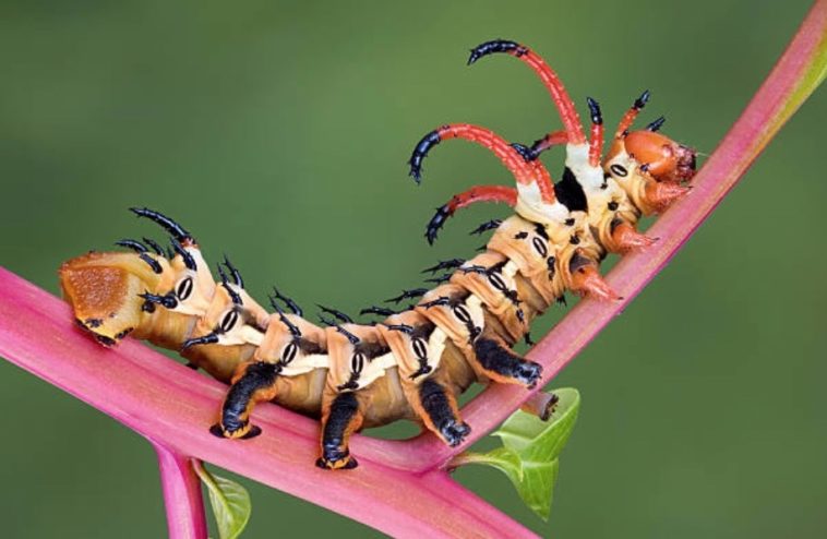 Cette chenille, destinée à devenir un papillon de nuit, est la plus grande d’Amérique du Nord. En effet, elle fait la taille d’une main. Dotée d’épines effrayantes, cette chenille turquoise, dont le nom scientifique est Citheronia regalis, pourrait faire peur. En réalité, elle ne pique pas !