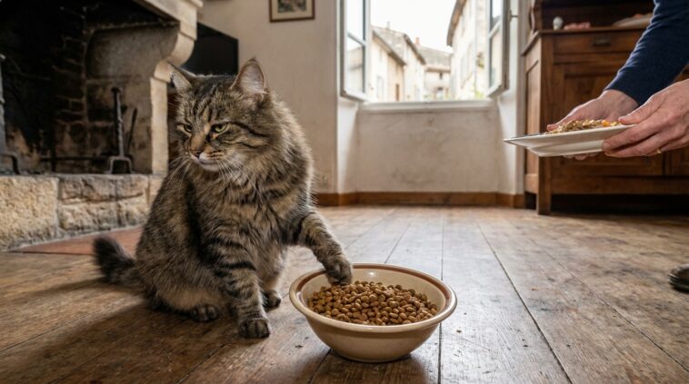Étrange manie que celle de nos chats, toujours à renifler l’odeur alléchante de notre steak-frites alors que leur gamelle pleine les attend, indifférente, au coin de la cuisine. En cette période où l’hiver grignote les derniers rayons de soleil, où les repas à table rassemblent la famille autour de plats réconfortants – et d’arômes irrésistibles –, il n’est pas rare de surprendre son félin à lorgner plus sur le dîner familial que sur ses sempiternelles croquettes. Mais qu’est-ce qui pousse vraiment un chat à dédaigner son festin personnel au profit de notre assiette ? Simple caprice ou signal à décrypter…?